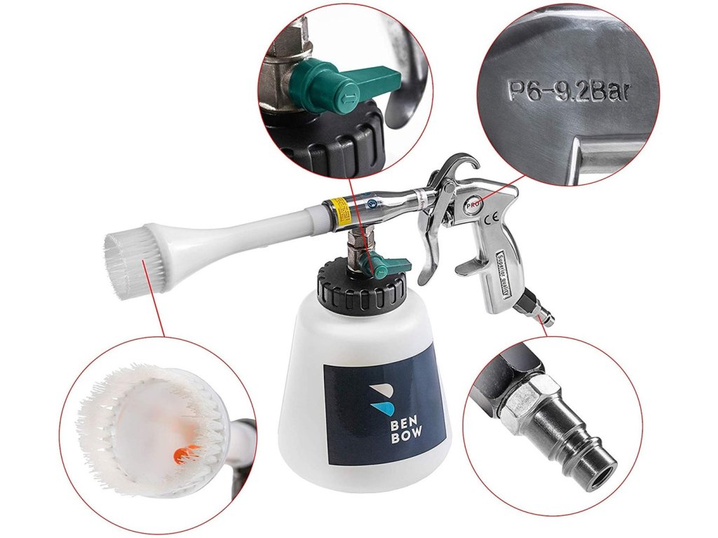 Benbow Classic je mycí zařízení, která pomocí stlačeného vzduchu čistí sedadla, čalounění a koberce. Tento čistič čalounění obnoví interiér vašeho vozu do téměř prvotřídního stavu a také zabrání pronikání nečistot a opětovnému znečištění.
