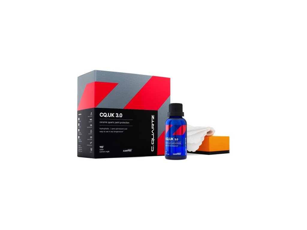CarPro CQuartz UK je světově proslulý a velmi uznávaný keramický povlak. Nová a vylepšená verze CQuartz UK 3.0 se snadno používá ve všech klimatických podmínkách. CQuartz UK 3.0 nabízí neuvěřitelnou odolnost vůči chemikáliím, soli a poškození vlivem životního prostředí, stejně jako ochranu proti UV záření. Vysoký obsah oxidu křemičitého (70 % SiO2) a křemene vytváří vrstvu pevného povlaku na povrchu lakovaných ploch. Díky tomu zvyšuje mechanickou odolnost laku a ve vysoké míře ho chrání před poškrábáním. Působením tepla pak nanopovlak postupně zvyšuje svoji tvrdost. CQuartz UK 3.0 dodává neuvěřitelnou vodoodpudivost a trvanlivost měřitelnou v rocích!
