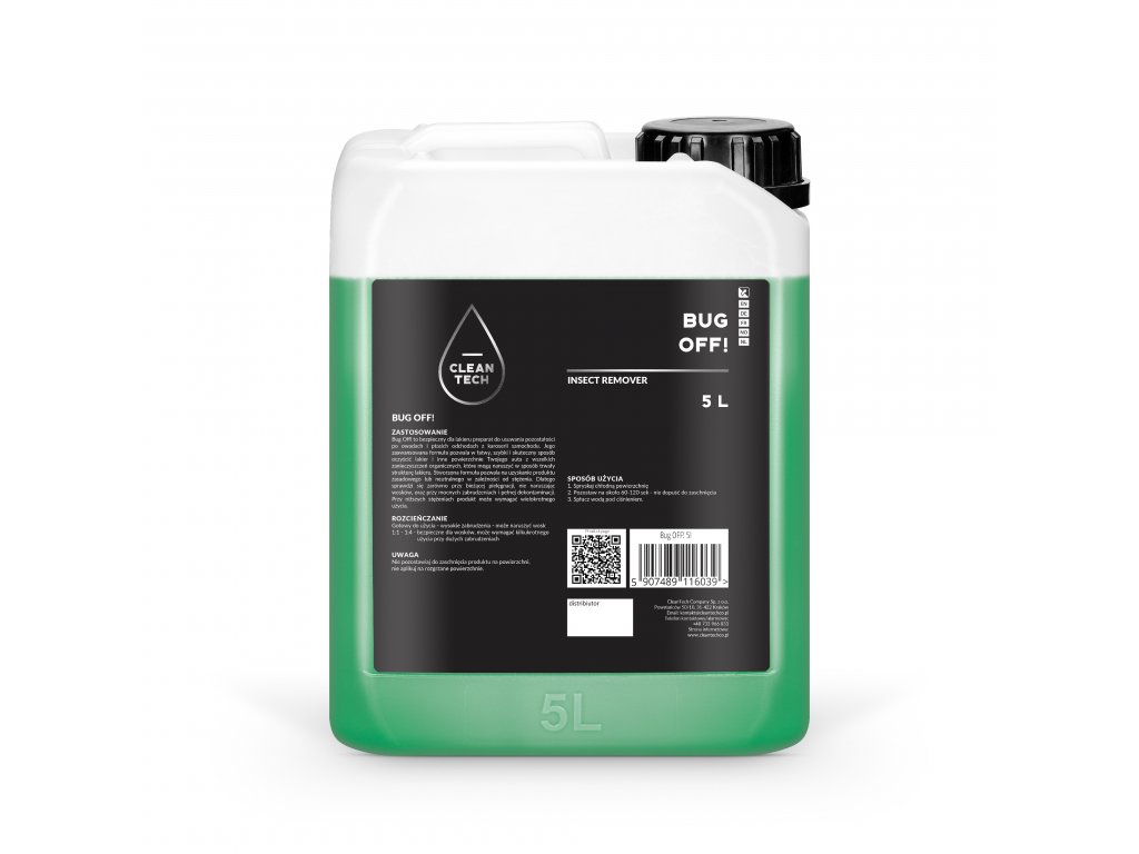CleanTech Bug Off - bezpečný pro lak a autodíly, odstraňuje zbytky hmyzu a ptačí trus. Jedinečné složení přípravku umožňuje snadno, rychle a efektivně očistit lak a další povrchy vozidla od jakékoli organické kontaminace, která může trvale poškodit strukturu laku. Receptura přípravku umožňuje získat alkalický nebo neutrální produkt v závislosti na ředění. Díky tomu bude perfektní jak pro průběžnou péči, bez poškození vosků, tak i pro silné nečistoty a plnou dekontaminaci. Při nižších koncentracích může být nutné opakovat několikrát.