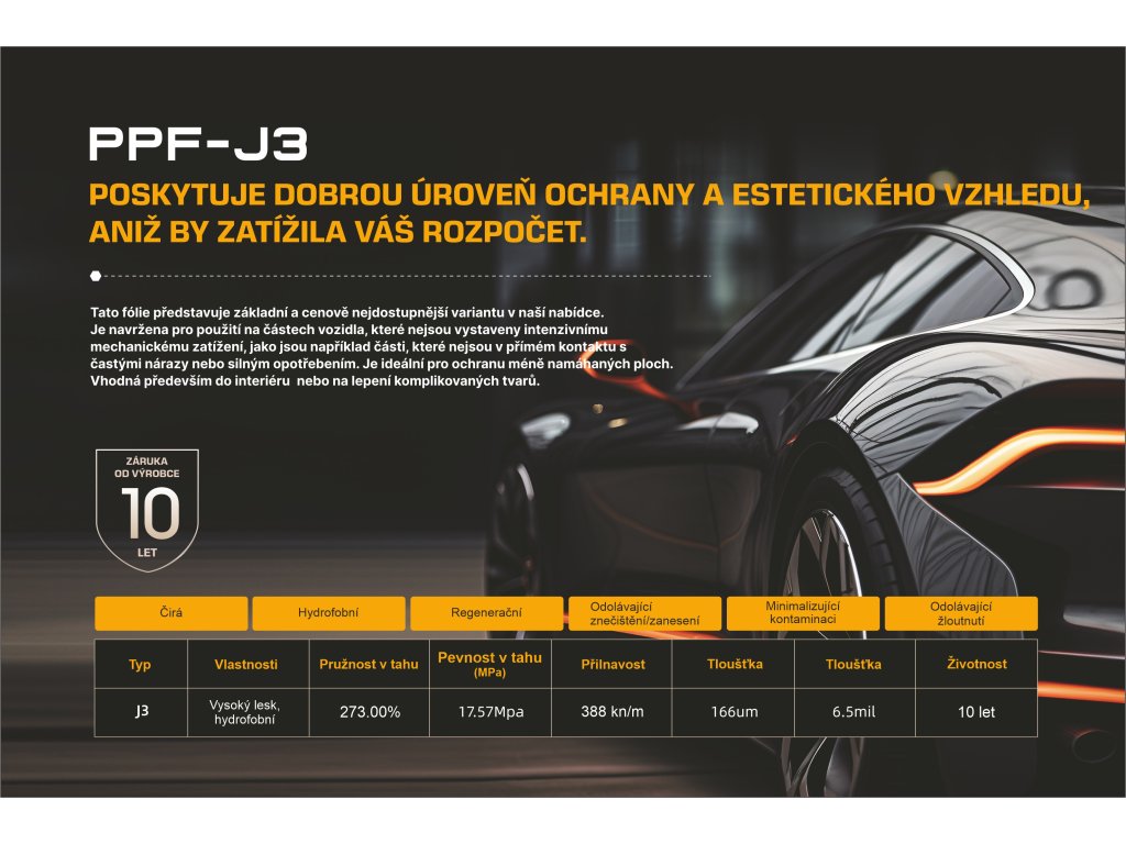 JEM PPF ochranná fólie je nejúčinnější ochranou laku. Inovativní technologie nám pomohla vytvořit produkt s vysokou samoregenerací, hydrofobností, vlastnostmi proti žloutnutí a odolností proti nečistotám. Nalepená fólie vytváří na laku ochrannou bariéru, která zabraňuje mechanickému poškození v důsledku jakýchkoli oděrek, škrábanců a třísek způsobených např. nárazy kamínků padajících zpod kol vozidla.