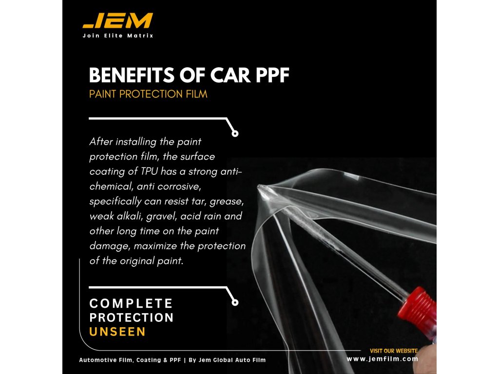 JEM PPF ochranná fólie je nejúčinnější ochranou laku. Inovativní technologie nám pomohla vytvořit produkt s vysokou samoregenerací, hydrofobností, vlastnostmi proti žloutnutí a odolností proti nečistotám. Nalepená fólie vytváří na laku ochrannou bariéru, která zabraňuje mechanickému poškození v důsledku jakýchkoli oděrek, škrábanců a třísek způsobených např. nárazy kamínků padajících zpod kol vozidla.