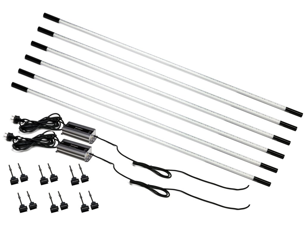 LINE LIGHT 6 sa skladá zo 6 osvetľovacích jednotiek 1630mm vrátane 2 ks 80W napájacích jednotiek, 2x8 m kábla a kompletných závesných svietidiel. Pretože LINE LIGHT je nízkonapäťový (24V DC) systém, môžete ľahko vykonať inštaláciu sami. Všetky základné armatúry sú dodávané s každou sadou spolu s napájacími zdrojmi a káblom.